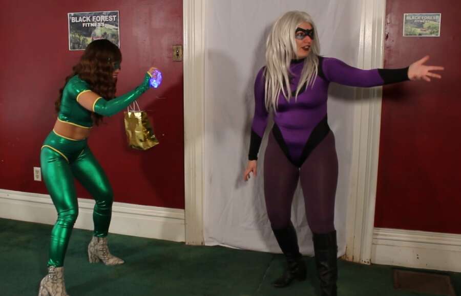 – Serpenta brashly breaks into one of Frija’s fitness centers looking for gold. She thinks she has struck it rich, when suddenly the alarm brings both Lunessa, mistress of the moonlight, and Savanna, the feline fury, onto the crime scene. Serpenta thinks she can stop them in their tracks with Drainium, but Savanna reacts to the meteorite in unpredictable ways, undergoing…’changes’. Can Lunessa pull Savanna back from the murderous brink of blind feral rage, and capture the slinky supercriminal?