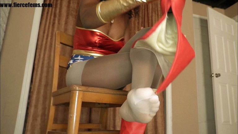 Sexy Ebony Paris Love stars as Ebony Avenger, A superheroine set out to defeat Professor Cyber and free her fellow sisters from his captivity. Ebony Avenger walks in through Professor Cyber’s hideout. Seeing that her boots may make too much noise, she slowly takes off her boots revealing her pantyhose covered size 11 feet. Little does she know that she is walking past a trap door she falls through and lands in the basement of Professor Cyber’s hideout. She is in a lot of pain from the fall and is unable to fight off the Professor’s “Truth Serum” a potion that serves to weaken superheroines and make them tell the truth. He pulls down her top and rubs all over her natural breasts. The villain interrogates her about the whereabouts of another Amazonian Sister, Queen Nubia. Loyal to her sisterhood, Ebony Avenger does not reveal the information. She is much too resilient and does not give in. She struggles but is not defeated and eventually overpowers the evil villain putting him in sexy scissorholds and breathtaking face sits. Now she is the one that demands answers, she wants to know where her sisters are. Unfortunately, she does not get what she wants, she here’s an alarm that Professor Cyber triggered. She knows that Professor Cyber has an army of henchmen and decides to escape before it is way to late. She will come back another day to defeat the villain