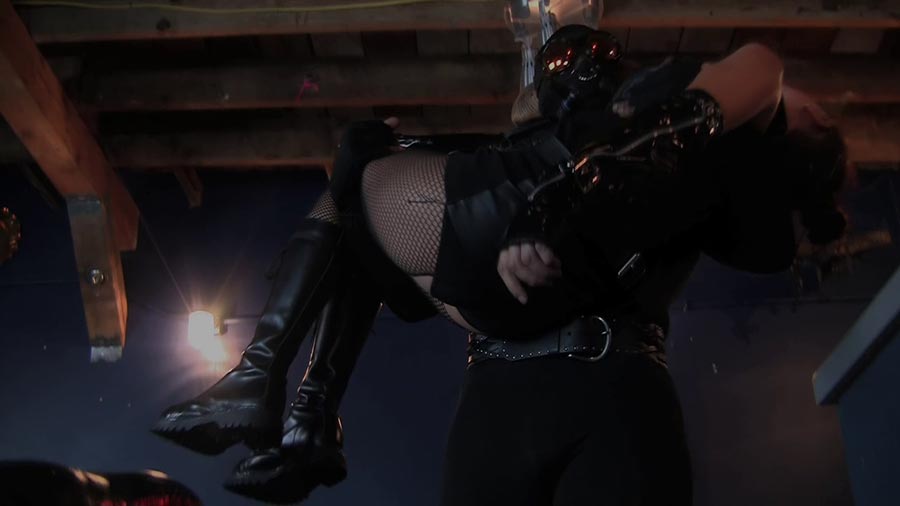 As a confused FearGirl Anomie considers her next move, the cruel-but-playful “O” (SELENE DRAKE) arrives, KO’ing both FearGirls with her shock prod, binding them in obviously vulnerable positions, and having her wicked way with them. And just when you thought it couldn’t get any worse/better, the Minotaur appears, KO’ing O, binding her to one of her own contraptions, and activating his new toy, a sexually-invasive robotic arthropod, the SentriPede! You get the picture.
