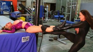 Then it’s time for the #1 contender’s match–and Charlotte is ready, but where is Jessica? Instead, The Dominator comes out and announces that Jessica is unconscious in the dressing room–and that Charlotte is next! The Dominator is true to her word, and DEMOLISHES poor Ice Cold with tons of low blows and wedgies and nipple pinches, and then even forces Ice Cold to fuck herself with a dildo!